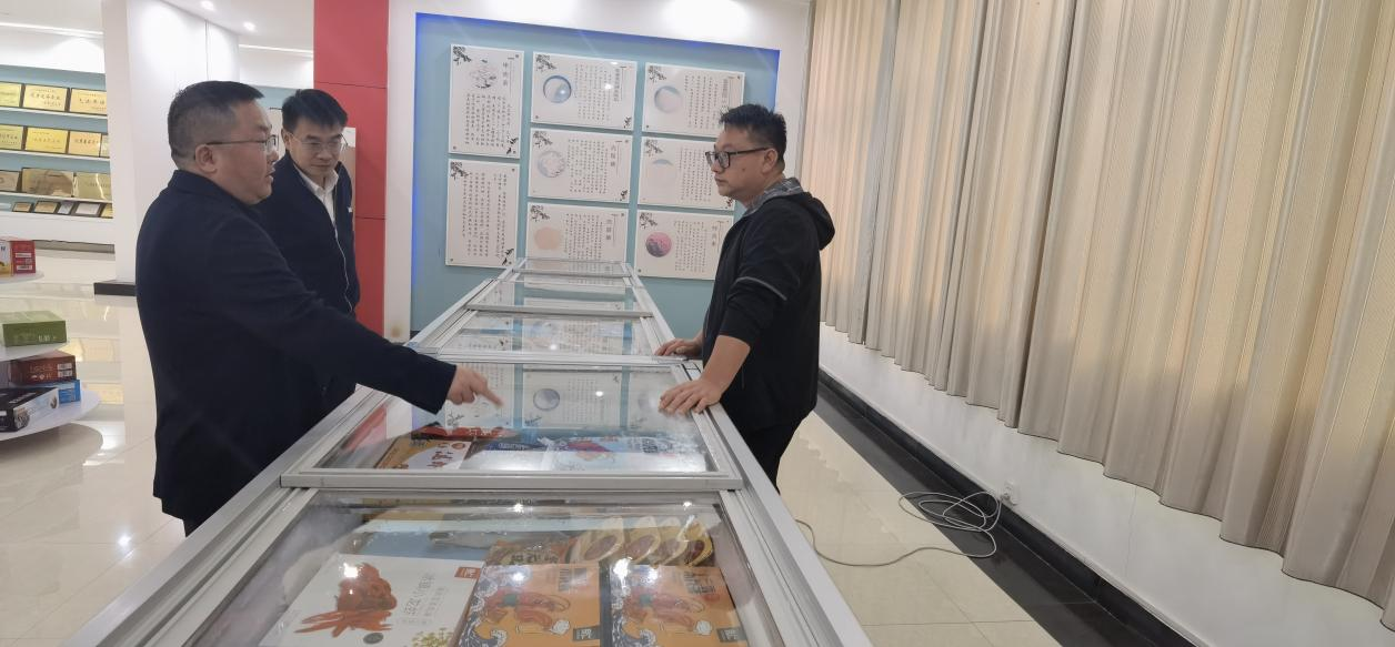 吴康兵副经理(左一)和王鹏主任(左二)了解企业产品情况